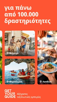Με περισσότερες από 200.000 δραστηριότητες στα χέρια σας, η GetYourGuide καλύπτει κάθε επιθυμία. Είτε αναζητάτε την αίγλη του Πύργου του Άιφελ, την ιστορία του Κολοσσαίου, είτε επιθυμείτε να βυθιστείτε σε μια αυθεντική γαστρονομική περιήγηση στη Βαρκελώνη, η επιλογή είναι δική σας. Η ευκολία του προγραμματισμού εν κινήσει είναι απλά αξεπέραστη: λάβετε άμεση επιβεβαίωση και εισιτήρια απευθείας στην κινητή σας συσκευή, χωρίς την ανάγκη εκτύπωσης. Επιπλέον, με τη δυνατότητα πρόσβασης εκτός σύνδεσης στις κρατήσεις σας, μπορείτε να εξερευνήσετε με απόλυτη ηρεμία, οπουδήποτε κι αν βρίσκεστε.
