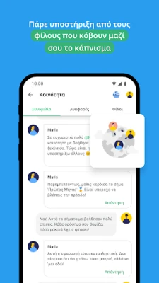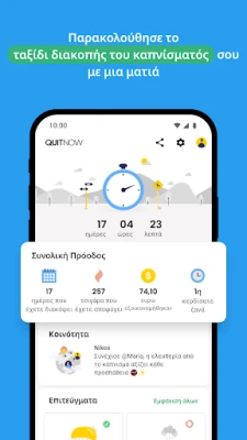 Η ορατή πρόοδος είναι ζωτικής σημασίας για την ενίσχυση του κινήτρου. Γι' αυτό, στην κεντρική σας οθόνη στο QuitNow, θα παρακολουθείτε ανά πάσα στιγμή πόσος χρόνος έχει περάσει από το τελευταίο σας τσιγάρο, τον εντυπωσιακό αριθμό των τσιγάρων που αποφύγατε, τα χρήματα που έχετε εξοικονομήσει και τον επιπλέον χρόνο ζωής που έχετε κερδίσει. Ταυτόχρονα, το QuitNow σάς προσφέρει ένα ανεκτίμητο πλεονέκτημα: μια ζωντανή κοινότητα πρώην καπνιστών. Μέσα από το ειδικό chat, θα συνδεθείτε με ανθρώπους που κατανοούν την κάθε σας πρόκληση, μοιράζοντας εμπειρίες και αλληλοϋποστήριξη σε ένα περιβάλλον απαλλαγμένο από καπνό. Επιπλέον, τα 80 ορόσημα που προσφέρει το QuitNow λειτουργούν ως μικρές, καθημερινές επιβραβεύσεις, διασπώντας τον μεγάλο στόχο σε εφικτά βήματα και γιορτάζοντας κάθε σας νίκη από την πρώτη κιόλας ημέρα.