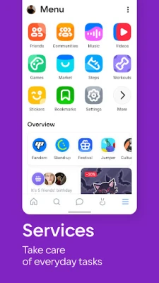 Η εμπειρία του VK ολοκληρώνεται με μια πληθώρα πρόσθετων λειτουργιών. Παρακολουθήστε ζωντανές ροές, μοιραστείτε στιγμές μέσω φωτογραφιών, διασκεδάστε με παιχνίδια και ενημερωθείτε για τα τελευταία νέα μέσα από θεματικές ροές ειδήσεων που επιλέγετε εσείς. Εμπλουτίστε τις γνώσεις σας με μια μεγάλη ποικιλία podcasts ή μοιραστείτε τις δικές σας ιστορίες και ιδέες ανεβάζοντας το δικό σας περιεχόμενο. Το VK υποστηρίζει ενεργά και την ευεξία σας: παρακολουθήστε την υγεία σας και διατηρήστε τη φόρμα σας. Συνδεθείτε με τη συσκευή σας για να ανταγωνιστείτε φίλους στον ημερήσιο αριθμό βημάτων, ανεβαίνοντας στην κορυφή του πίνακα κατάταξης και ενθαρρύνοντας έναν πιο δραστήριο και υγιεινό τρόπο ζωής.